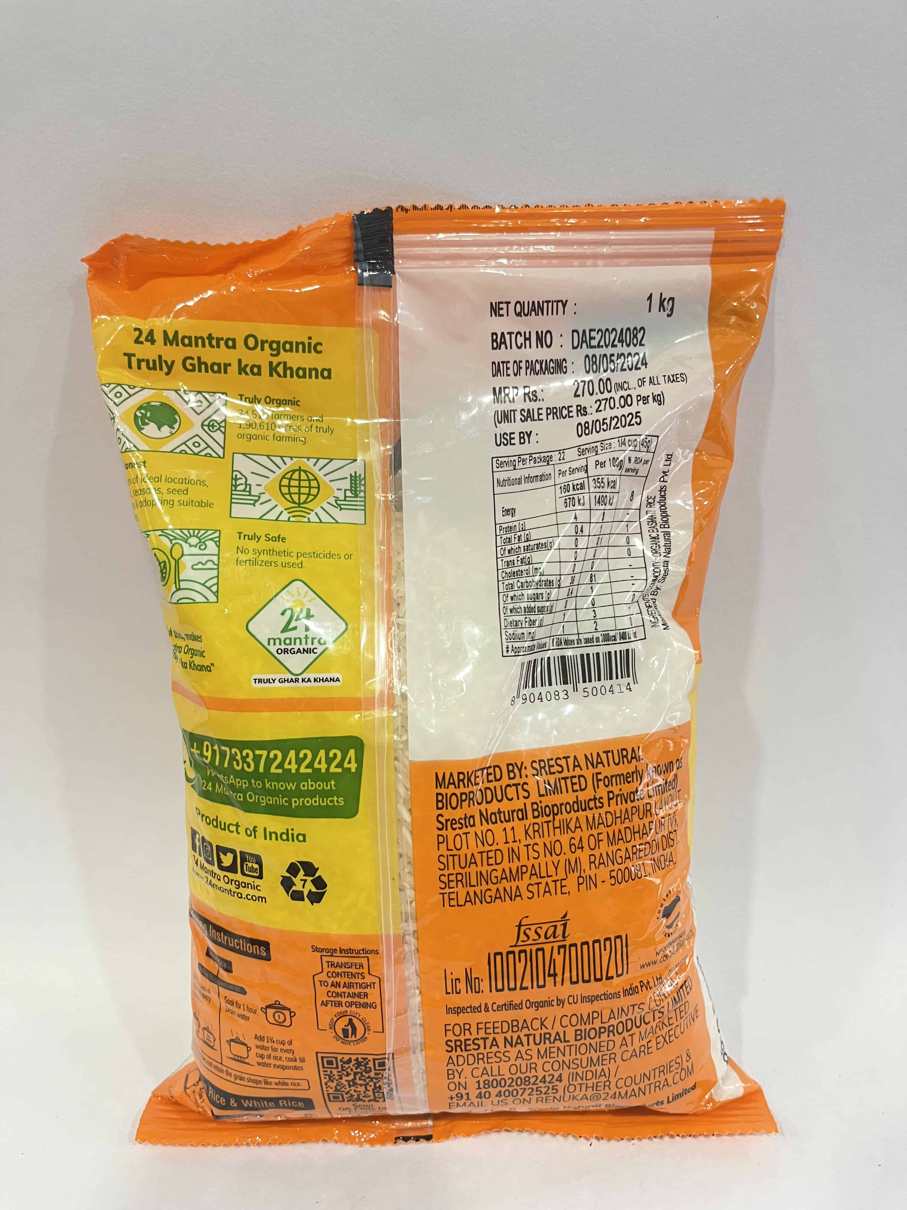 Store 24 Mantra Organic Basmati Rice in an airtight container in a cool, dry place. The rice will last for up to 6 months when stored properly.